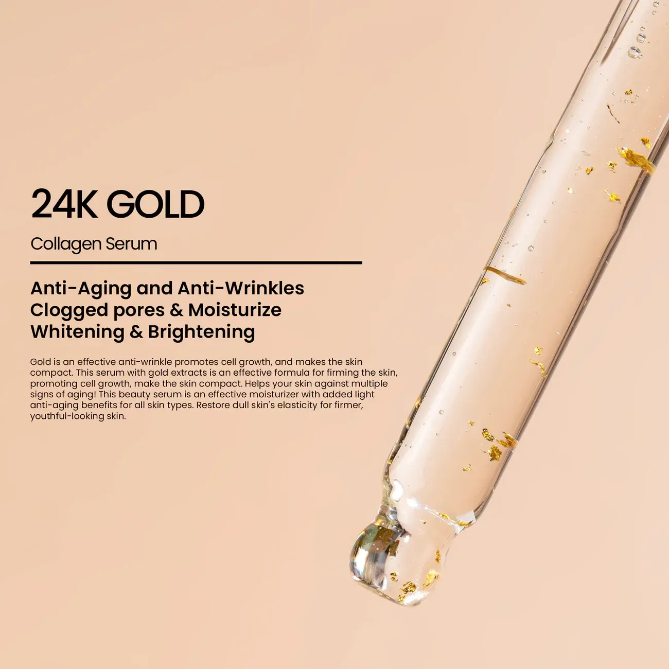 Gold is an effective anti-wrinkle promotes cell growth, and makes the skin compact. This serum with gold extracts is an effective formula for firming the skin, promoting cell growth, make the skin compact. Helps your skin against multiple signs of aging! This beauty serum is an effective moisturizer with added light anti-aging benefits for all skin types. Restore dull skins elasticity for firmer, youthful-looking skin.